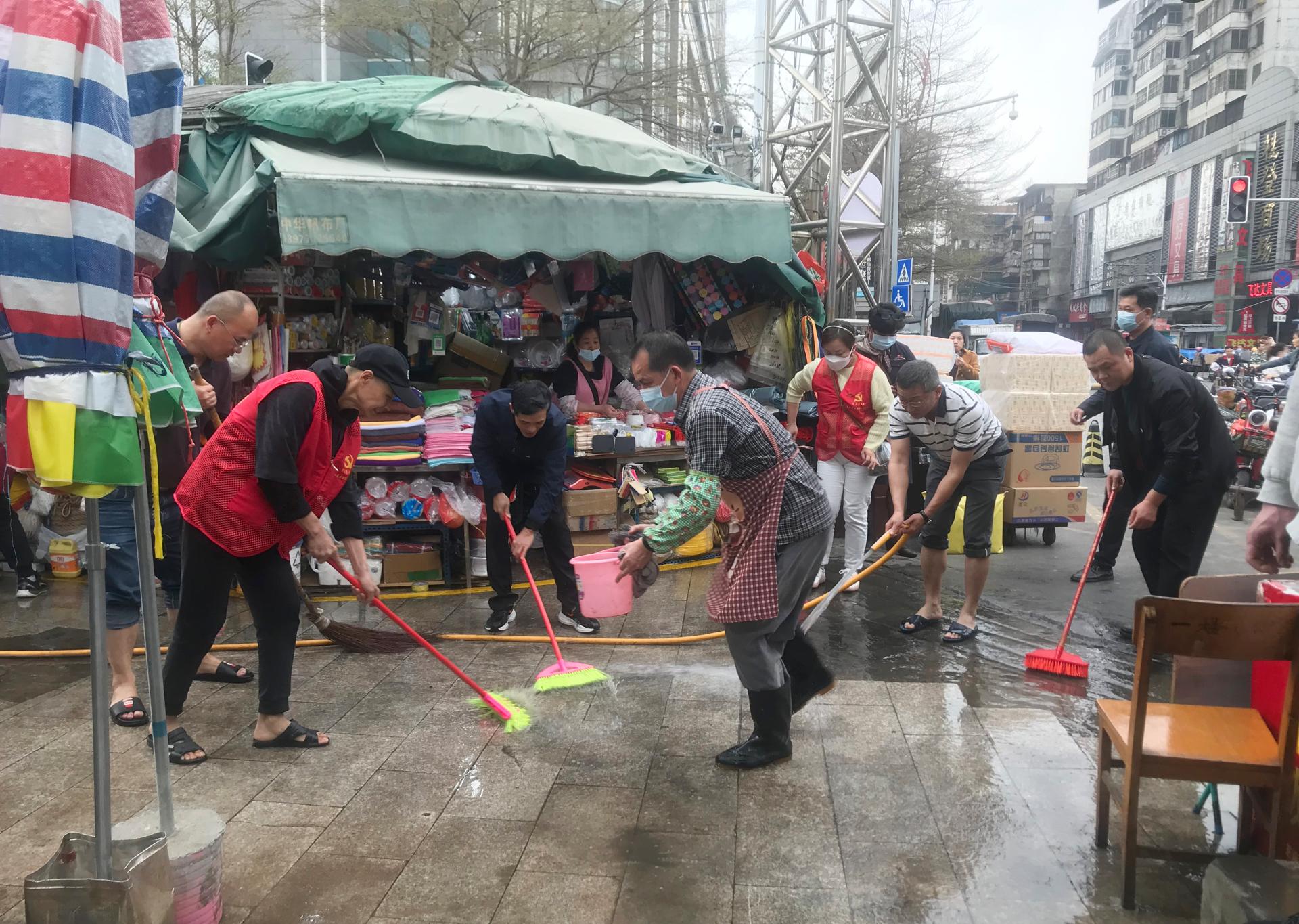 黨員志愿者與經(jīng)營戶清掃街道