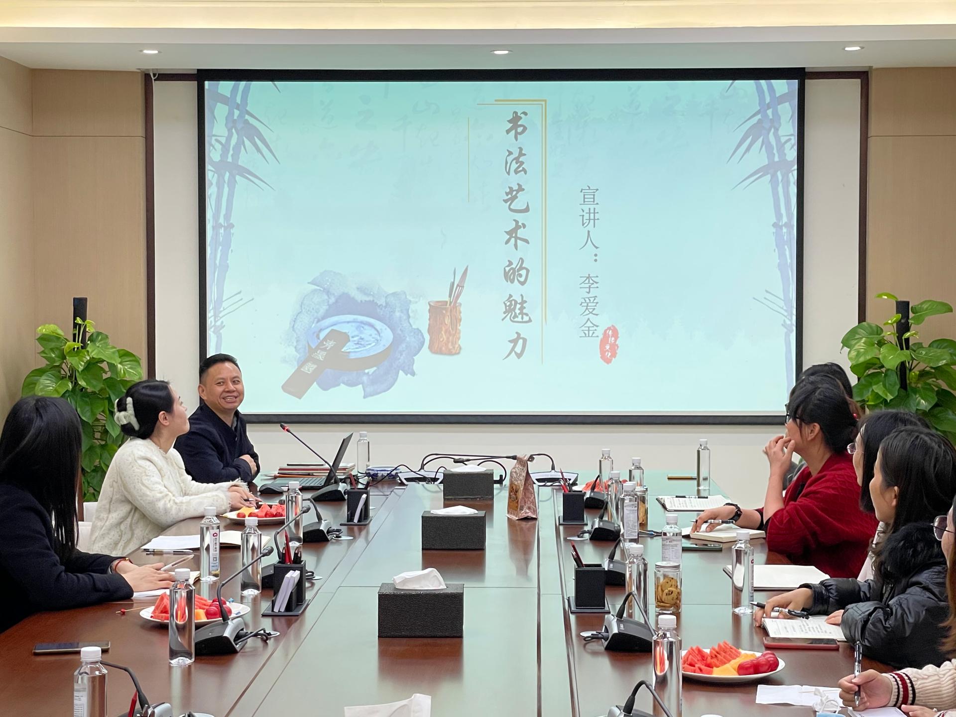 集團(tuán)機(jī)關(guān)黨總支書記李愛金在課上講解書法知識