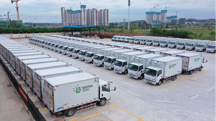 配送現(xiàn)場配送發(fā)車2020年11月2日,南寧市第一批50所公辦學校正式開始食材集中采購集中配送服務。首日配送食材數(shù)量達20噸左右,最長配送線路往返達136公里。配送前檢測出兩批次食材農(nóng)殘超標,涉及200千克左右蓮藕以及少量韭菜,配送前農(nóng)殘超標食材已全部進行處理,保障了學校的食材安全。11月2日凌晨2時,位于五象新區(qū)的威耀供應鏈公司五象配送基地現(xiàn)場燈火通明、熱火朝天,進入正式配送前的臨戰(zhàn)狀態(tài):各學校食